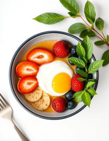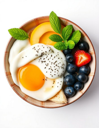 Fried egg with berries and mint in a bowl isolated on white background