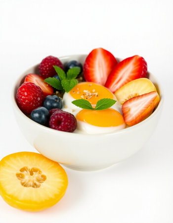 Yogurt with fresh fruit and berries in a bowl on white background