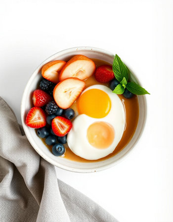 Breakfast with berries and fried egg in bowl on white background
