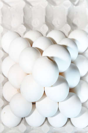 Close-up of white eggs in a carton, part of a large wholesale supply ready for delivery to stores.