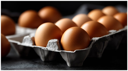 a close up shot of brown eggs in a cardboard carton, set against a dark surface with soft studio light