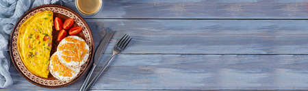 Breakfast. Omelette with cheese and sandwiches with salmon and cucumber on white plate. Frittata - italian omelet. Top view, banner
