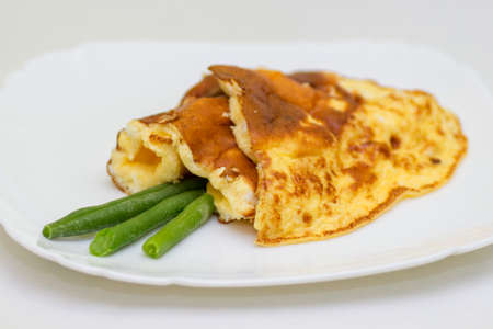 French omelette with seasonal green asparagus vegetables, tasty food for healthy vegetarian lunch on white board