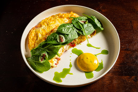 A delightful omelette is served with creamy sauce and fresh spinach for a vibrant dish.