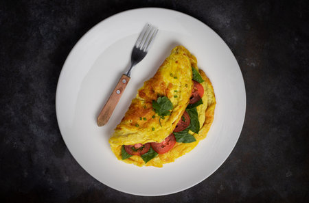 Healthy vegetable loaded omelette. Top view table scene over a dark stone background.
