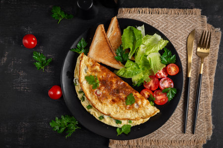 Omelette with cheese, tomatoes and green herbs. Omelette, salad and toast. Keto, ketogenic lunch. Healthy breakfast. Top view