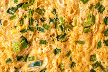 A macro shot capturing the texture of a homemade omelet cooked with fresh green onion slices. Delicious and healthy breakfast concept. Perfect for food blogs and recipe illustrations.