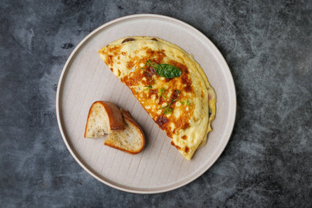 A warm breakfast setting featuring a golden cheese omelette garnished with greens, a slice of crusty bread. Perfect for food, cafe, morning, and cozy dining themes.