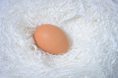Easter concept. Egg on white cloth Copy space for your text. Top view