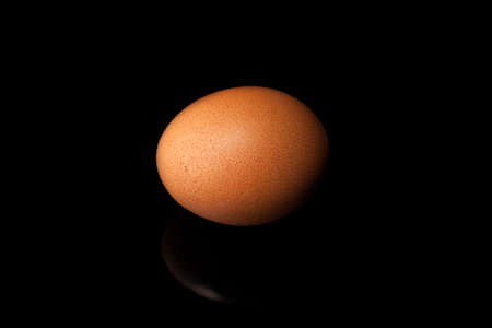 A single, light brown egg stands on a reflective green surface, casting a subtle shadow against a dark, solid backdrop. Minimalist and elegant.