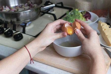 Close-up of a woman's hands cracking an egg into a bowl.generative ai