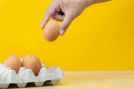 hand picked fresh egg from paper tray, on wood table and yellow background