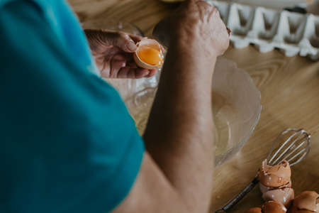 senior caucasian woman hands breaking white chicken egg above white bowl
