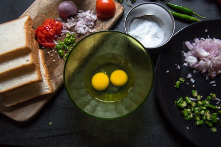 Flat lay above egg and eggshells on kitchen a green spoon on an electric black plate with natural light.