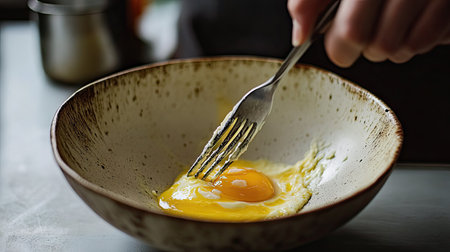 A ceramic bowl of eggs being whipped with a fork, showing a simple and homely preparation.