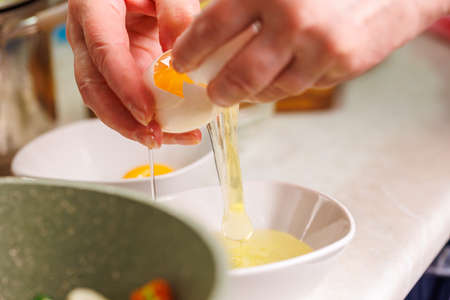 A woman holds a broken egg over a bowl in her kitchen. Food blogger. Social media concept. Horizontal orientation.
