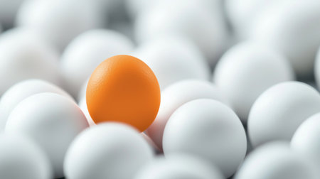 A single orange egg stands out amidst a cluster of white eggs, featuring a smooth, matte shell and a vibrant, contrasting color.