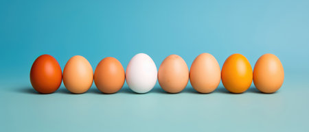 AI Generated. natural colored farm fresh eggs arranged on turquoise blue background with copy space
