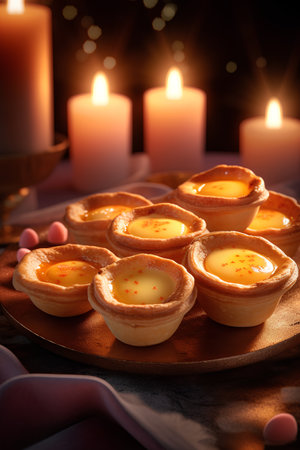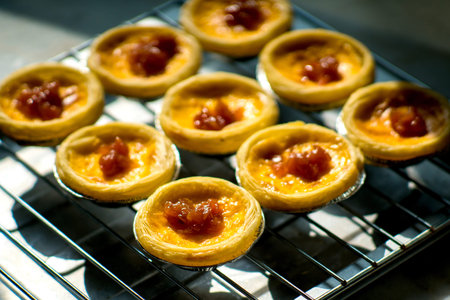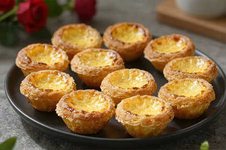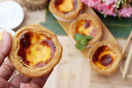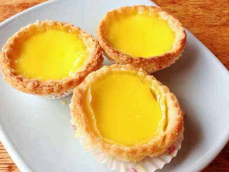 The egg tart is a kind of custard tart found in Cantonese cuisine derived from the English custard tart and Portuguese pastel de nata. Egg tarts are often served at dim sum restaurants and cha chaan