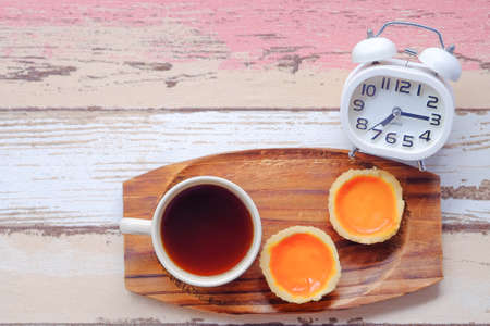 Egg tart, alarm clock and a cup of coffee on wooden background