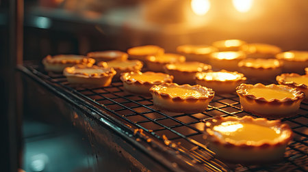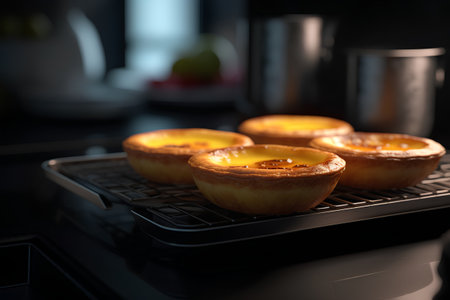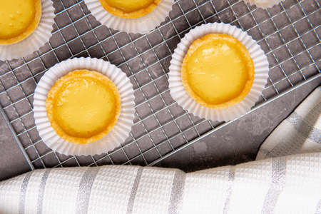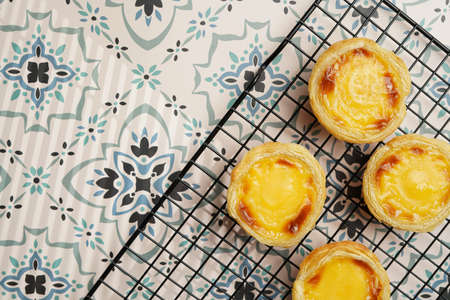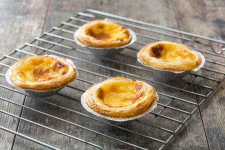 Traditional Portuguese custard tarts or Pastel de Nata freshly baked and cooling on rack.