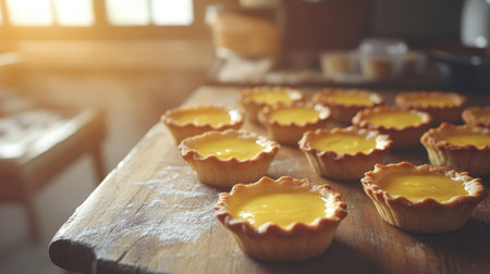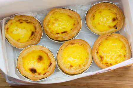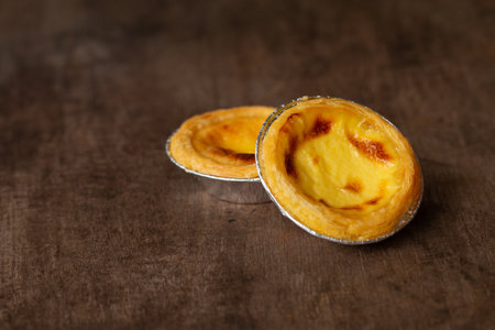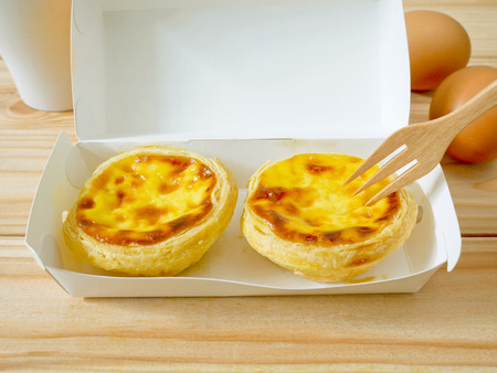 Egg tarts in aluminum foil cup on wood table, traditional Portuguese dessert served in coffee shop.