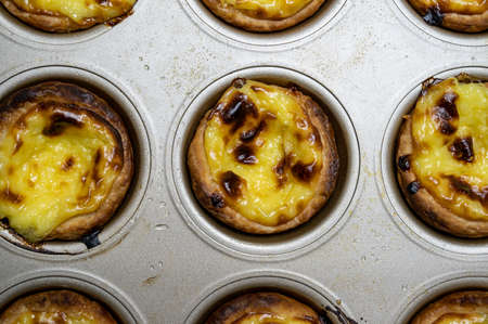 Egg tart, traditional Portuguese dessert, pastel de nata. Freshly baked. Fresh from the oven lie on a baking sheet.