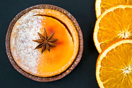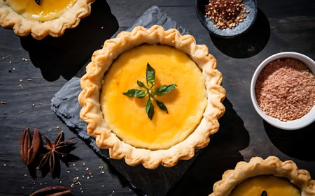 Egg tart, traditional Portuguese dessert, pastel de nata. Pasteis de Belem is a Portuguese egg custard tart pastry dusted with cinnamon.