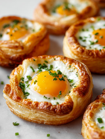 Crisp, flaky pastry cups cradle bright fried eggs, topped with vibrant chives, creating an irresistible morning dish full of warmth and inviting flavors.