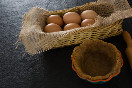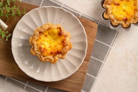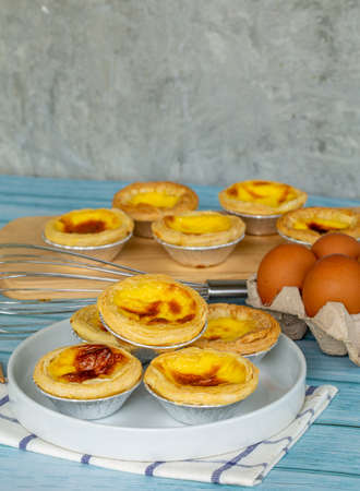 dessert egg tart or portugal egg tart sweet custard cream on white dish and blue wooden table with eggs ingredients