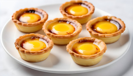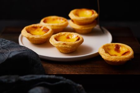 Egg tarts, traditional Portuguese dessert, pastel de nata on a plate.