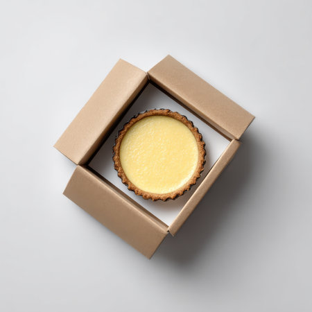 Fork picking fresh baked egg tarts or custard tarts (pastel de nata) in a takeaway box