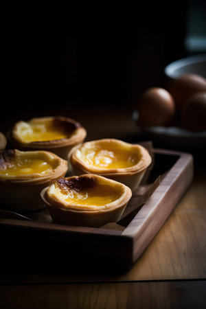 Pasteis de Nata or Belem Tart. Portuguese Custard made with Egg, Cinnamon, Sugar and Flour on Wooden Plate. Traditional Dessert.
