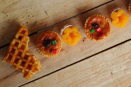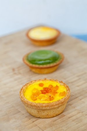 Mango tart, Egg tart and Steamed custard tart on a wood with copy space.