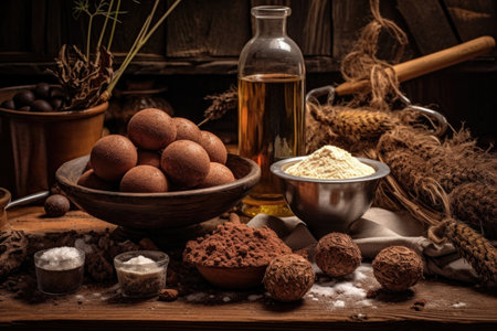 chocolate truffle ingredients on rustic table, created with generative ai