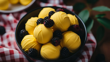 Top view of mango and banana flavored berry ice cream balls in a vibrant yellow container