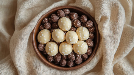 Capture the essence of indulgence with elegant chocolate truffles displayed atop a soft white surface, accented by delicate natural decor, inviting festive joy.