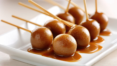 This image showcases several caramel apples on wooden sticks, arranged on a square white plate. The golden-brown apples are coated in shiny caramel, with some sauce drizzled on the plate. The composition suggests a close-up shot with soft lighting, ideal for food-related projects, culinary content, or commercial applications.
