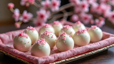 Elegant arrangement of white chocolate truffles with pink sprinkles on velvet tray and floral background. That the image is generated using AI.
