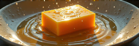 Glowing orange soap with water droplets in circular motion. That the image is generated using AI.