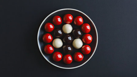 This image features a beautiful arrangement of colorful gourmet chocolates on a sleek plate, showcasing rich textures and vibrant colors perfect for any occasion.