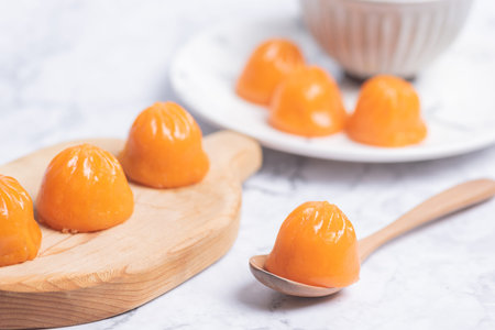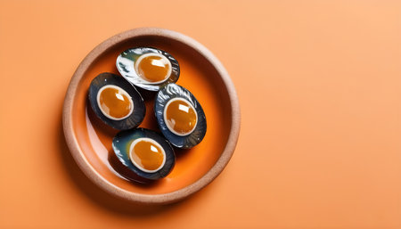 Chinese Century egg, preserved duck eggs. Orange background. Top view. Copy space.