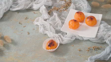 Delicious cake with egg yolk on a dark background. Toned.