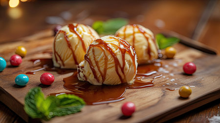 An inviting close-up of creamy ice cream scoops drizzled with caramel sauce, complemented by mint leaves and candies, set on a wooden table. Perfect for showcasing summer treats with space for your caption.