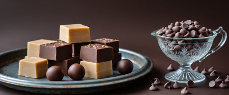 AI Generated. Retro metal tray featuring fudge and truffles accompanied by a glass sugar bowl and chocolate chips on a dark backdrop
