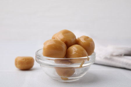 Tasty hard toffee candies in glass jar on light table, closeup