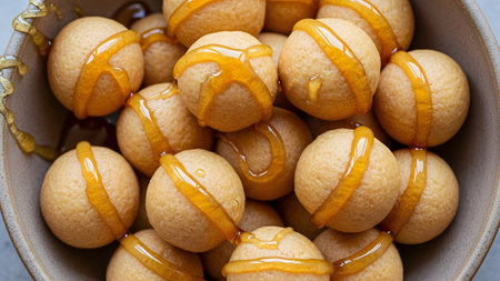 A tempting scene of golden pastries drenched in maple syrup and drizzled with caramel. Perfect for showcasing dessert delights and culinary creativity.