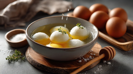 A beautifully arranged scene featuring freshly cracked eggs in a bowl with thyme, honey, and salt on a rustic kitchen countertop, perfect for culinary inspiration.