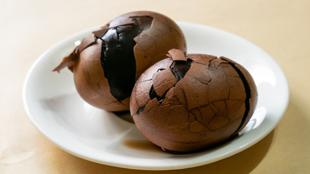The close up of Taiwan Tea Eggs on mini white plate.