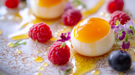 A vibrant dessert featuring creamy spheres topped with honey and surrounded by fresh raspberries and blueberries. Perfect for elegant dining occasions.